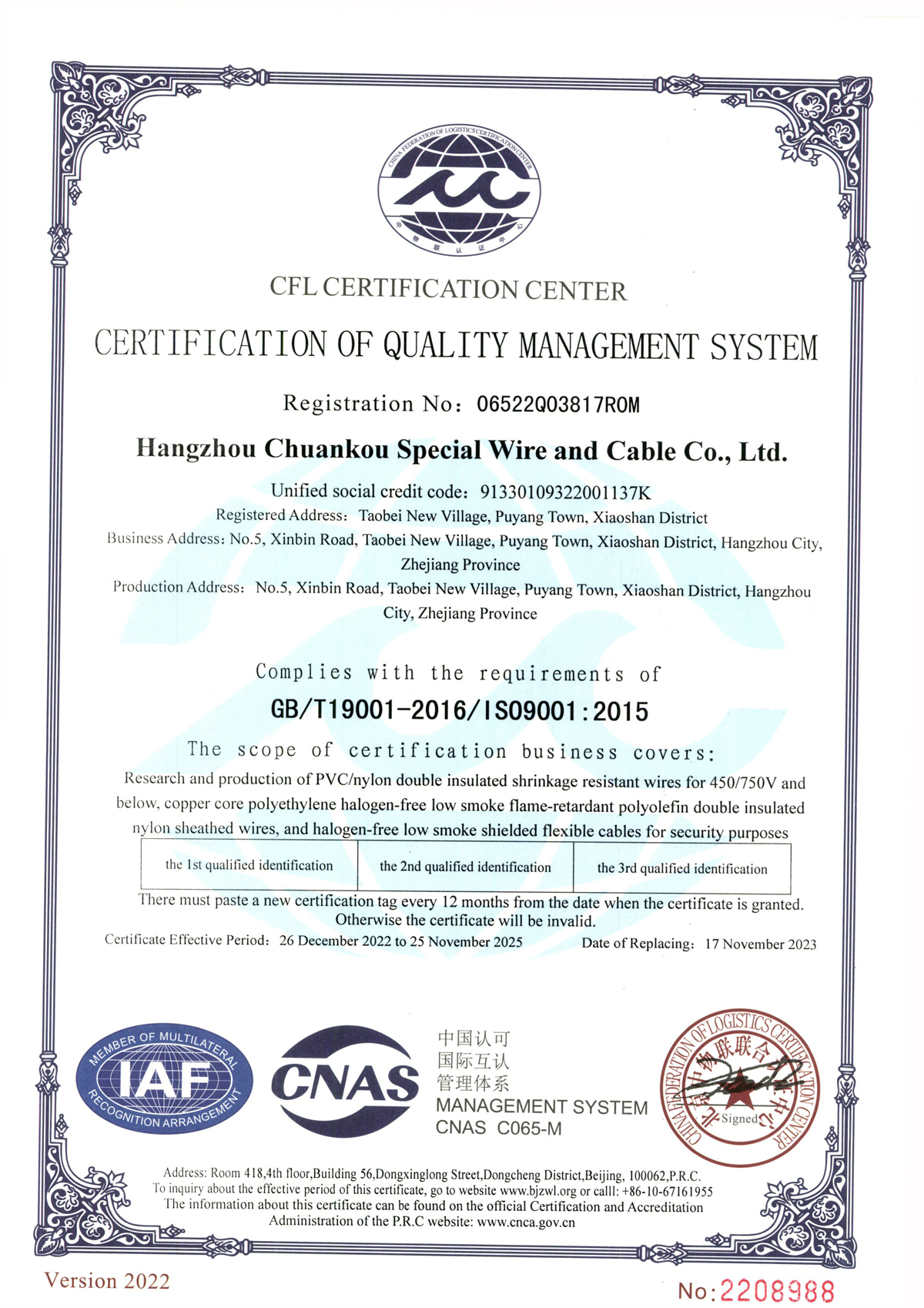 ISO9001质量管理体系认证证书最新版-2022 英